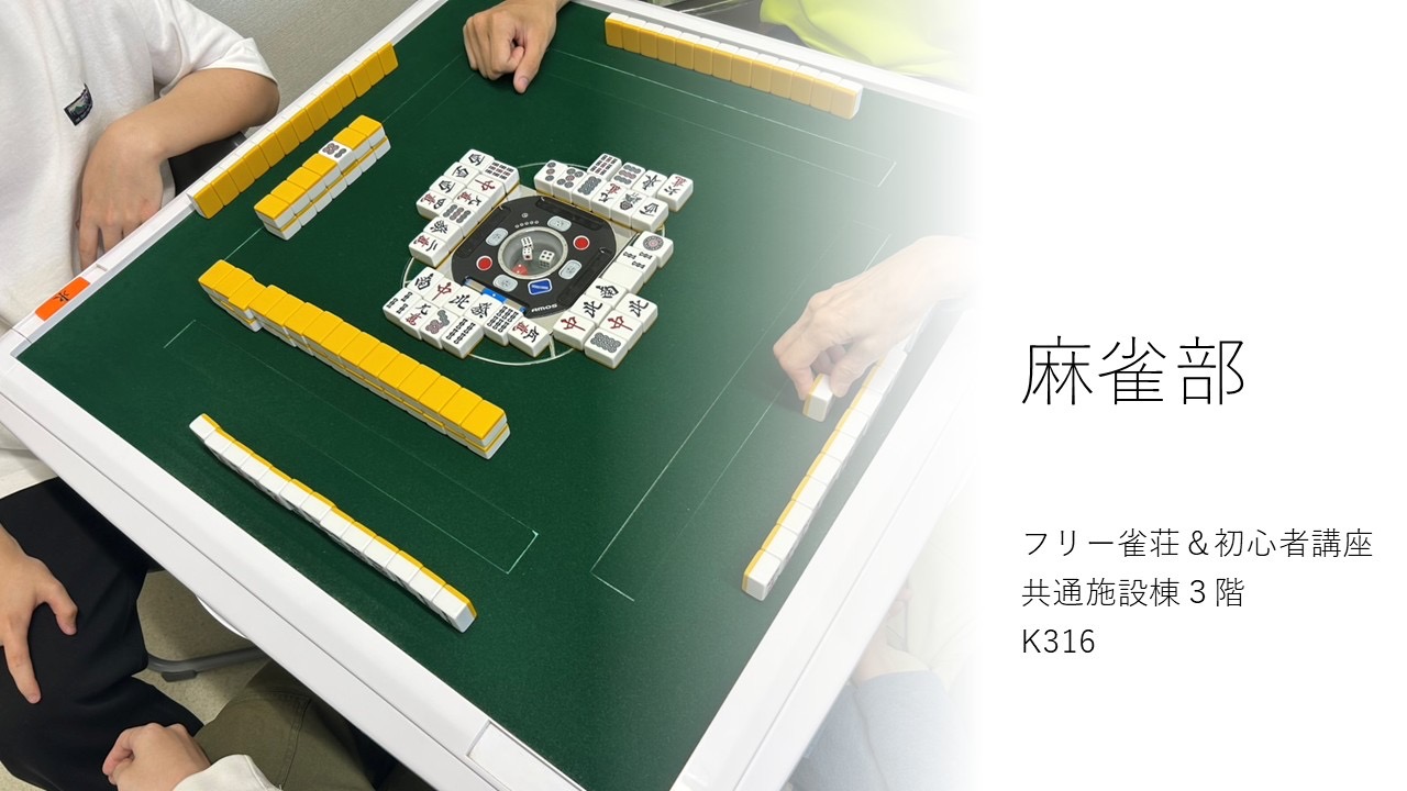 HOME > ご案内 > イベント 潮風祭について 今年度開催情報 お問い合わせ 公式HPへ フリー雀荘・ドンジャラ 開催概要 主催 麻雀部 開催日時 両日10:00~16:00 開催場所 K316 戻る