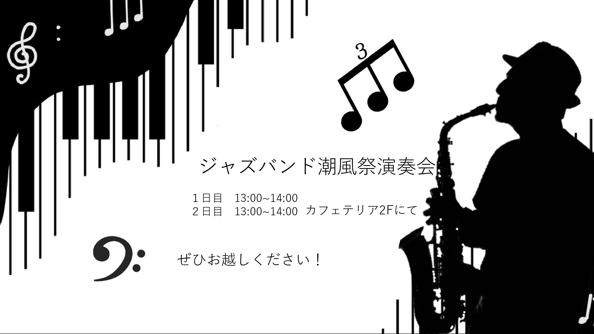 HOME > ご案内 > イベント 潮風祭について 今年度開催情報 お問い合わせ 公式HPへ ジャズバンド演奏会 開催概要 主催 ジャズバンドサークル 開催日時 両日10:00~16:00 開催場所 カフェテリア2階 戻る